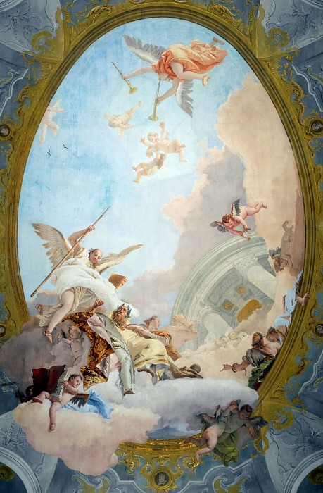 Towards the end of the Renaissance, divinity was depicted as more light and airy and less earthy and apocalyptic. Giovanni Battista Tiepolo, 1696, created paintings founded on the High Renaissance that were ceiling frescoes and altarpieces. Allegory of Merit Accompanied by Nobility and Virtue exemplifies the light in colour and airy in feel aesthetic that has influenced much of our impression of divinity.