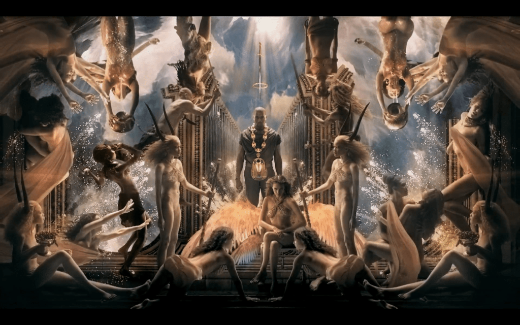 Similar to Michelangelo’s veiled criticism, the Renaissance references in Power act as a powerful lens to interrogate the social systems of today and a criticism of those in power. This message, that is supported by the Christian iconography could be seen as irreverent and satirical, but for Renaissance art this wouldn’t be the first time. The difference here being that the song is an example of how divinity in Renaissance art can be adorned by the audience through the incantation of lyrics – majorly because of the divine art it is associated with. The tribal chants enhance the hyper-sensationalism of the visuals and present a primitive and apocalyptic feel that entrances the audience.