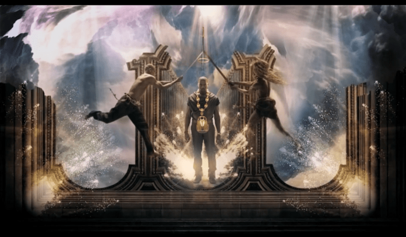 The winged woman at the feet of West signifies the phoenix, due to the carriage of golden wings. The lyrics mention a ‘beautiful death’ and the visuals show West will be killed before the scene cuts to black. West says