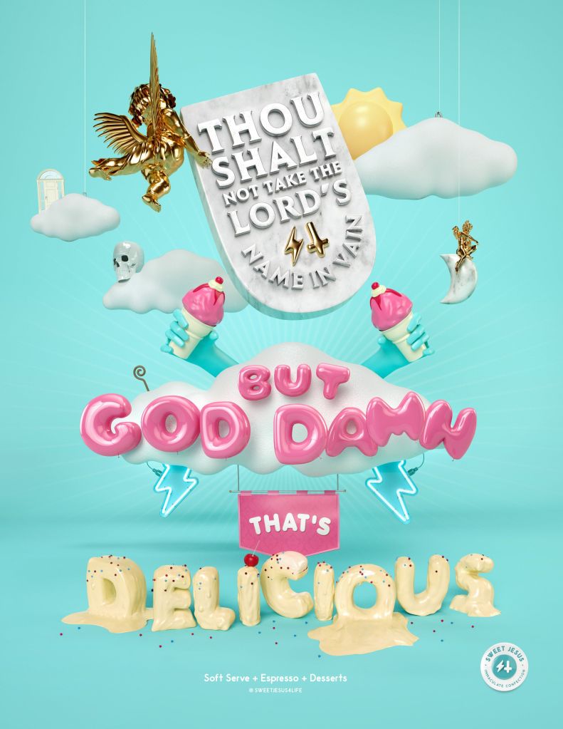 Another example of the celestial interpretation from Renaissance art is the marketing campaigns from an ice-cream company called ‘Sweet Jesus’ by ‘One Method’ agency. The colours of a celestial sky indicate the rising of the sun as a visual representation of the rising of Christ. Unlike Equinox, the Sweet Jesus advert uses a palette of unblended colours with no subtlety to visual references or text. The use of 3D art in the advert establishes a new era from the Renaissance influences it uses, it embraces modern mediums and simple composition yet retains the essence of Christian art. To get their point across they used a biblical commandment and iconography from 16th Century art – not other depictions of divinity, indicating that the divinity in Renaissance is widely understood and encapsulated as though the time itself was ethereal and divine.