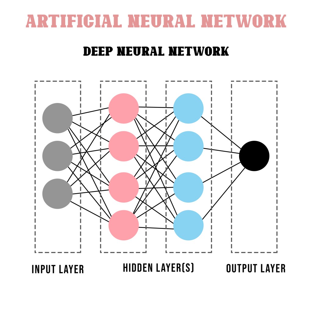 Artificial Neural Network uses simulated neurons; individual nodes that can be connected to and send messages to others. There’s always an input and output layer and typically always at least one hidden layer between them. When there’s more than one hidden layer it’s called a Deep Neural Network – this is where the deep in Deep Learning comes from.