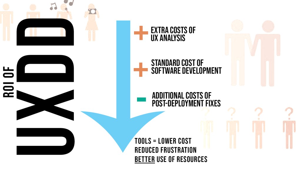 These three steps to UXDD do not take place sequentially not alternatively – there are two distinguishable sprints. One to build screens and one to build systems. UXDD is based on a two-phase waterfall, each developed in a fully agile manner. The economics of UXDD are low-cost design on the front-end because the screen face, iterative design of the front-end is actually pretty quick and cheap since it doesn’t require any coding plus leads straight into back-end implementation.