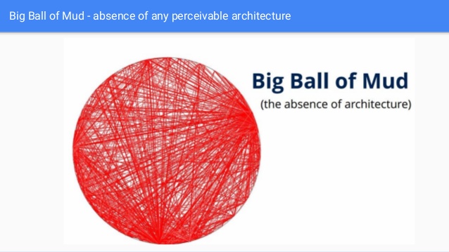Brian Foote and Joseph Yoder coined the term “Big Ball of Mud” which is a euphemism for software disaster. A Big Ball of Mud is a software system that grows badly and controlled and is really hard to fix. It’s an intricate system full of hidden dependencies, duplicated portions of code and unclear identification of layers. It is nearly always the result of teamwork and doesn’t happen overnight.